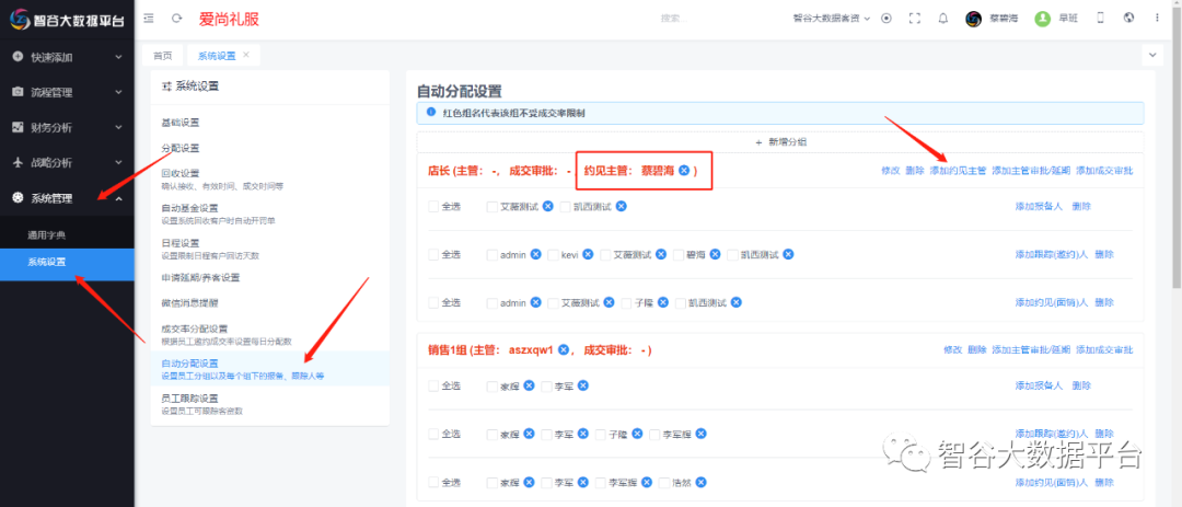 在系统管理-系统设置-自动分配设置,在相应分组启用选择约见主管设置