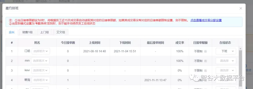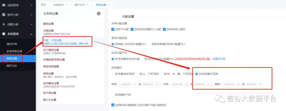2.系统设置=》分配、分组设置:签到模式新增‘排班模式’选项设置