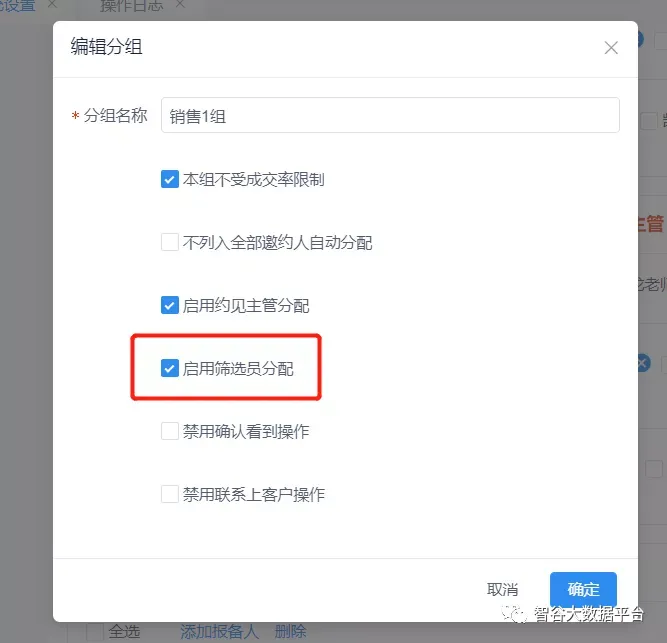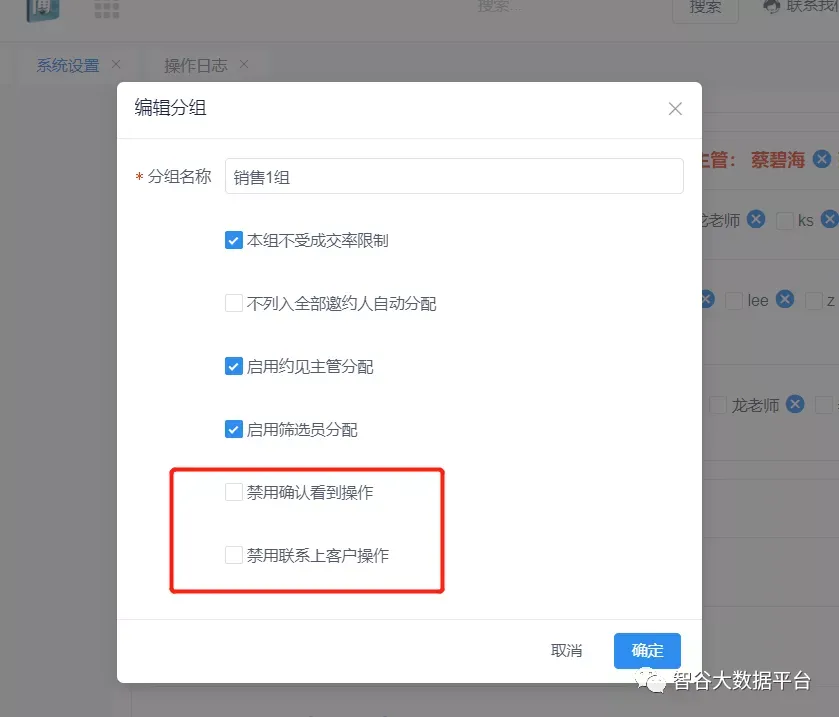 4.员工分组新增‘是否禁用确认接收’、‘是否禁用联系上’设置