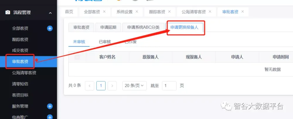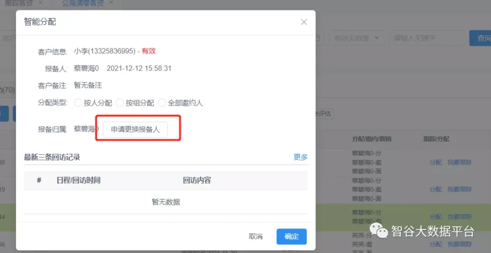1.无效、清零客资智能分配新增‘申请更换报备人’操作,申请后需审批(有权限控制)