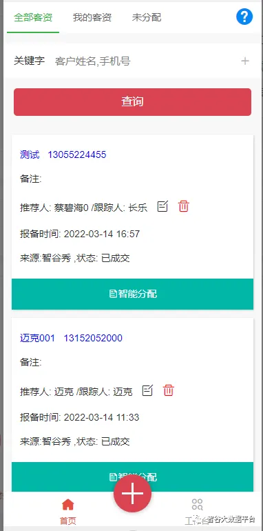 在软件工作台中,点击全部客资,就能查到我们报备的所有客资,同时自己账号报备的客资与未分配的客资都在这里!