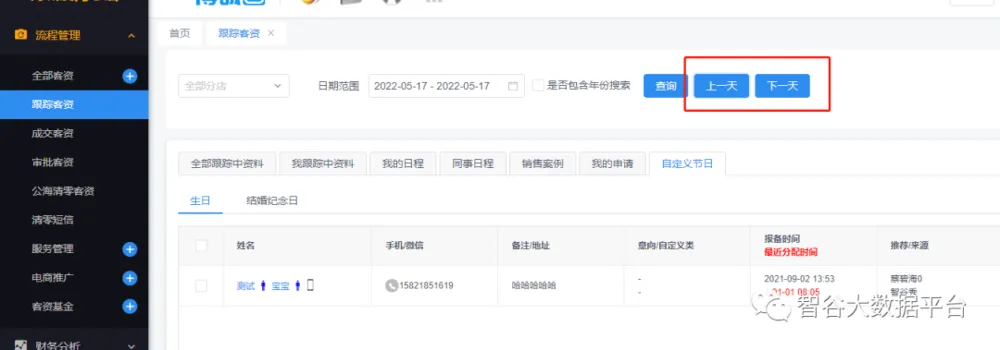 1.跟踪客资-自定义节日新增:分店、上一天、下一天查询