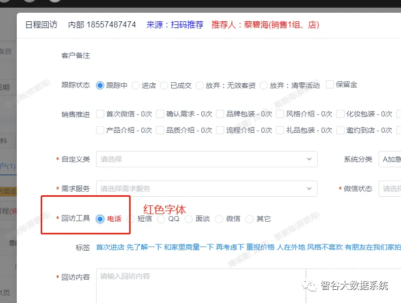 3.回访日程回访工具选项,如果是必须上传图片,则回访工具选项红色显示