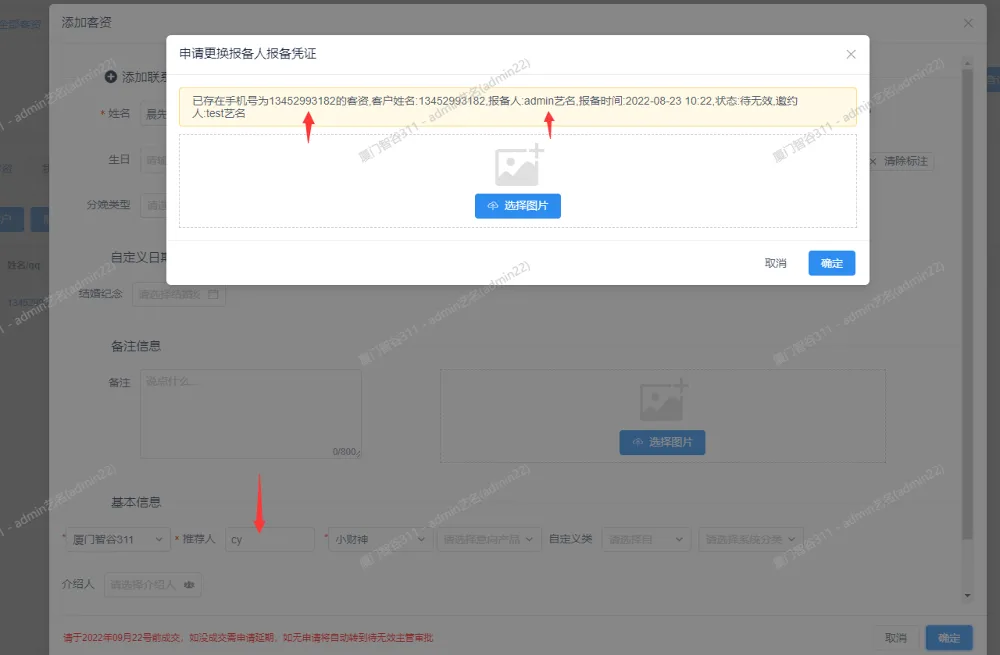 1.报备客资新增如果存在审批、无效等重复客资,则弹窗提示上传凭证功能