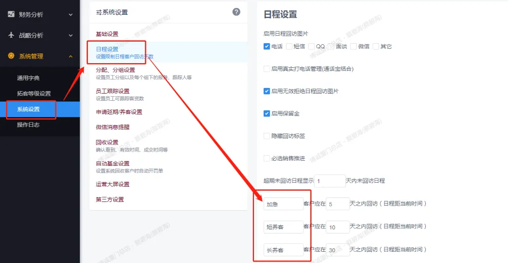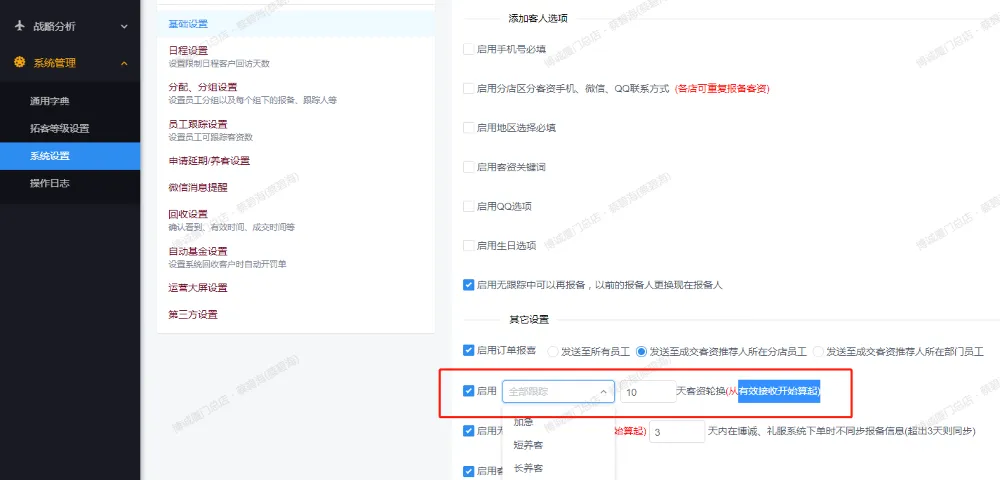 3.系统设置-》基础设置:N天客资轮换新增按系统分类筛选设置