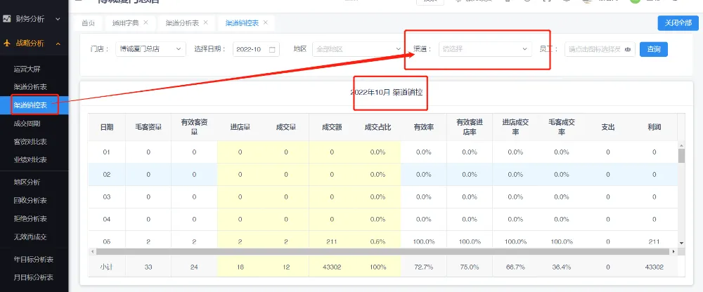在渠道销控中,可以统计每日的渠道总支出、成交数据,成交比,有效率等数据。在查询中,可以选择按单个渠道来源来进行数据分析!