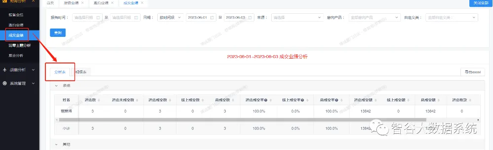 智谷客资软件中财务数据分析的成交业绩表它能够帮助您统计所有成交员工的成交数据其中包含:进店数,线上成交数、进店成交数,进店成交率,线上成交率,成交额等数据的统计!