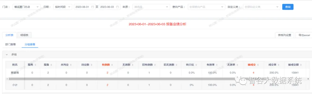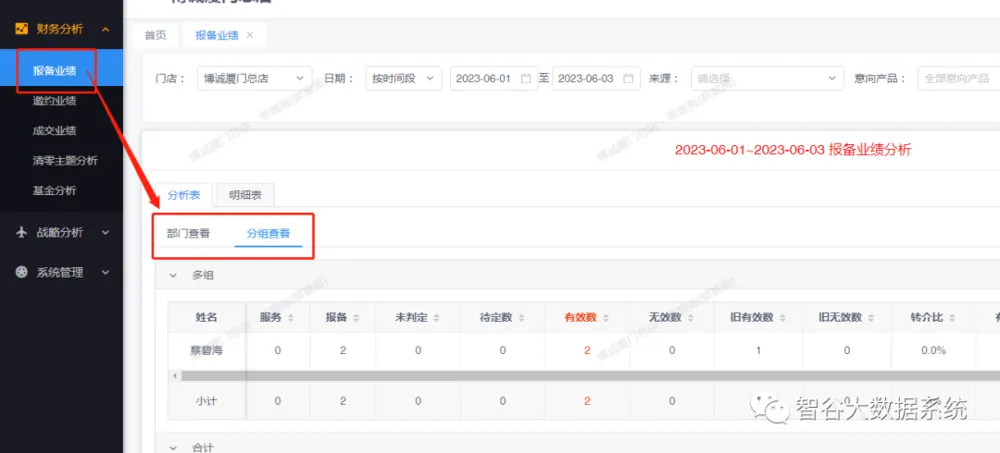 智谷客资软件中财务数据分析的报备业绩表中可以按部门或者分组的形式来统计客资报备的数据, 在此表格中主要给用户统计在某个时间段内(或者自然月)中员工的的报备数据、有效数、无效数、有效率、成交率、成交金额等数据。