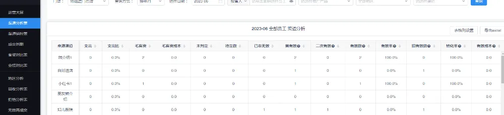 智谷客资软件中战略分析数据表格-渠道分析表,本表主要统计各客资渠道的数据其中包含各渠道的支出、支出比例、有效数、有效率、无效数、无效率、进店数、进店率、成交数、成交率等这些数据(具体可以参照软件表格)。