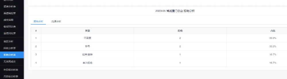 智谷客资软件中战略分析数据表格-拒绝分析表,本表主要统计分析每个无效客资在跟踪后判定为无效公海客资的拒绝原因,可以帮助我们管理人员更加了解客资无效的原因并及时调整话术活动内容等!