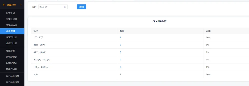 智谷客资软件中战略分析数据表格-渠道分析表,本表主要统计分析每个成交客资从分配跟踪到最终成交的周期时间的统计