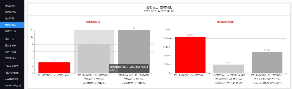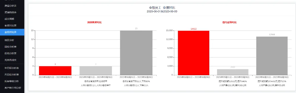 业绩对比表:本表主要体现没个月成交客资的业绩与上月成交客资的业绩、去年同月成交客资业绩的对比。