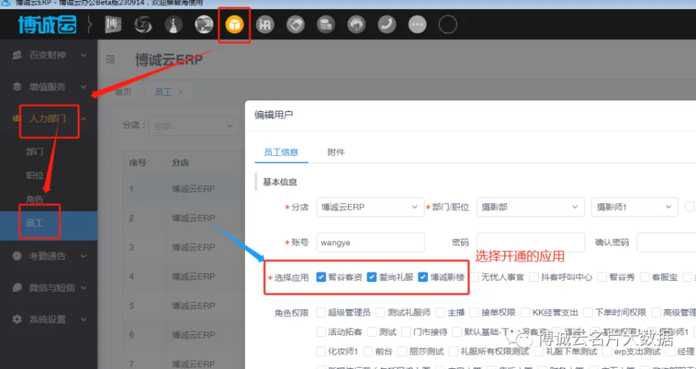 需要使用两个应用的员工账号需要再同一企业内,然后在模块宝-人力部门中-员工修该账号然后勾选对应的应用与角色权限