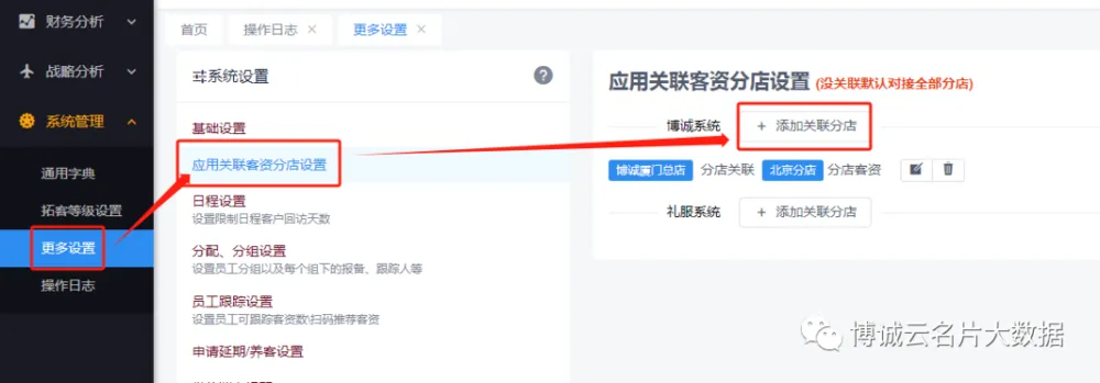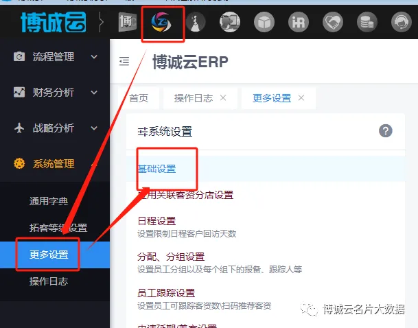 在客资CRM系统中点击系统设置-更多设置-基础设置-找到启用博诚下单(图一、图二)
