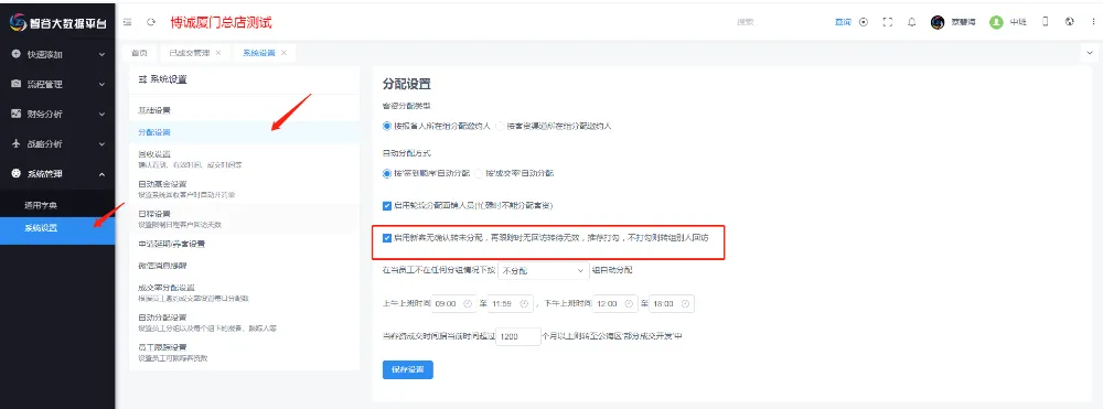 (打钩)另一种是没处理直接跳转到公海 由专人再进行分配或者让员工自己去找回来 这也是我们比较推荐的一种设置