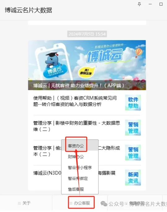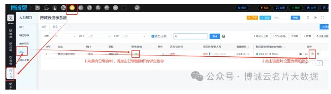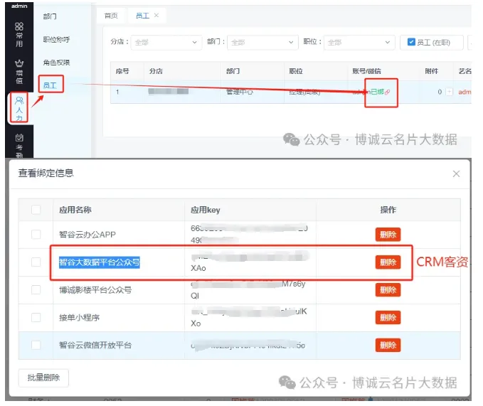 重新扫码关注博诚云名片大数据公众号,点击办公客服-智谷办公后根据网页提示输入商码、账号、密码绑定账号(账号如果没有开通,请联系管理员新增员工账号,员工账号新增请看下面的问题)