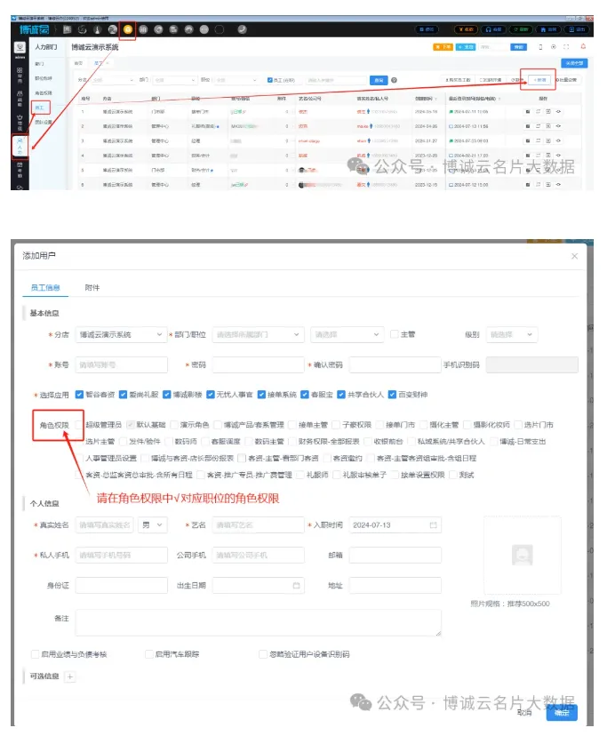 新入职的员工,在正常工作后应该赋予该员工博诚云的工作账号来报备客资,请在博诚云的模块宝中点击人力-员工-新增账号(右上角)-并在角色权限中打钩√对应职位的角色权限并注意√角色权限上方的应用:智谷客资:(如下图)