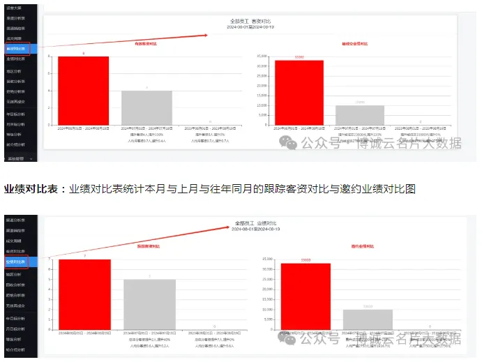 客资对比表:客资对比表统计本月与上月与往年同月的客资数量与成交业绩的数据图形对比
