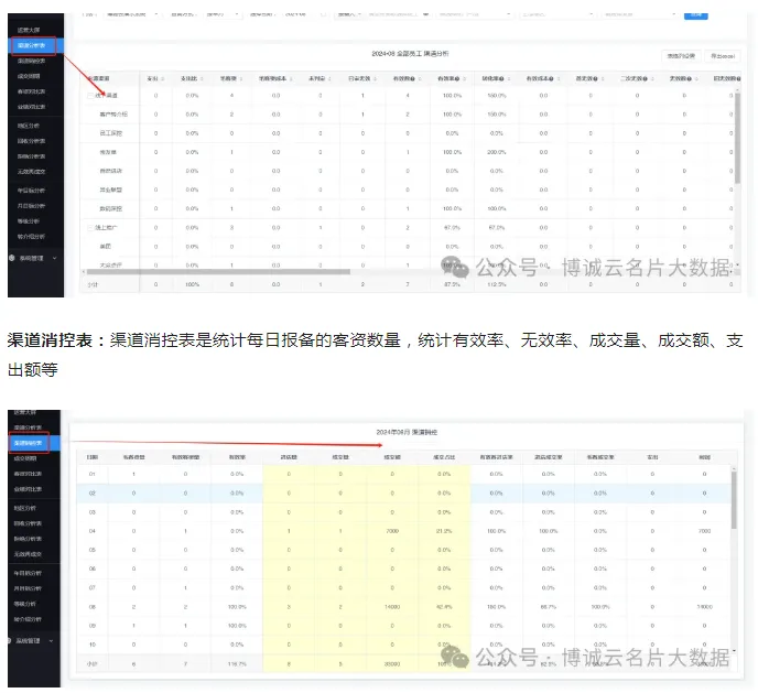 渠道分析表:渠道分析表可以统计分析每个渠道的渠道投入金额与成交的关系比例,同时统计每个渠道的毛客资数,有效客资数,成交数,无效数,成交金额等数据统计与分析