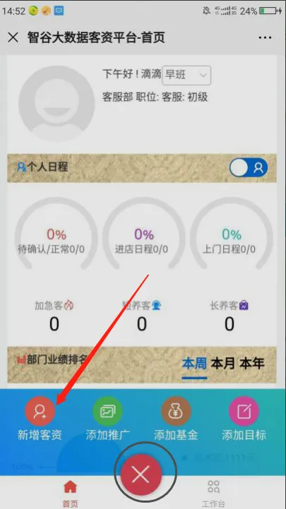 手机端报备客资登陆公众号选择微办公-“微客资”选择底部大红色+号选择“新增客资”