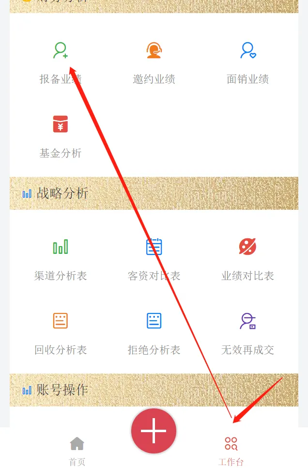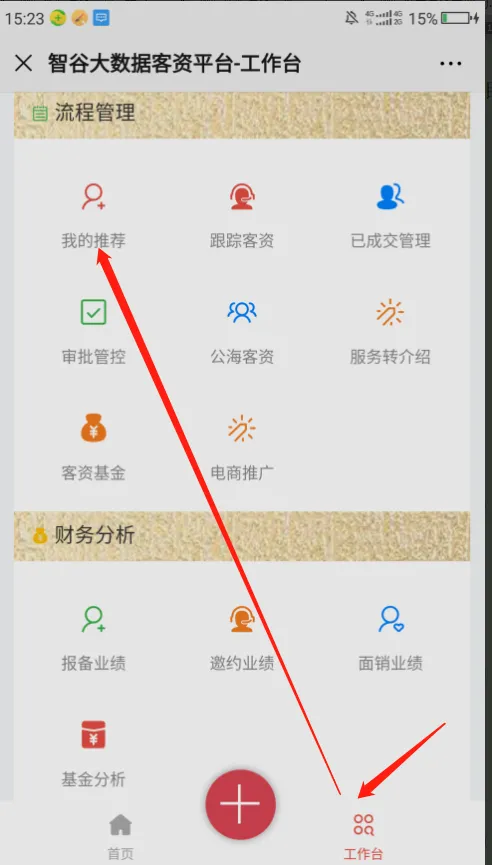 手机端-公众号-微客资-微办公-工作台-报备业绩。