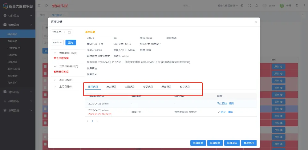 手机端在“工作台”-“我的推荐”中可通过“关键字”搜索指定客资选择客资去查看日程,流失,分配,成交等记录。