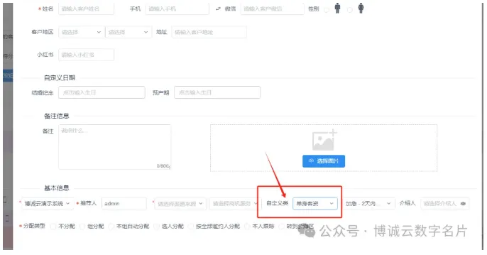 新增了自定义分类后,我们可以在报备客资时给这个客资选择分类(如下图)