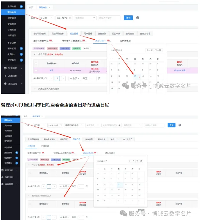 在日程回访中安排好了约见人员与约见时间后,在我们的回访日程中的进店日程就可以看到每日安排的进店日程是否成交了!