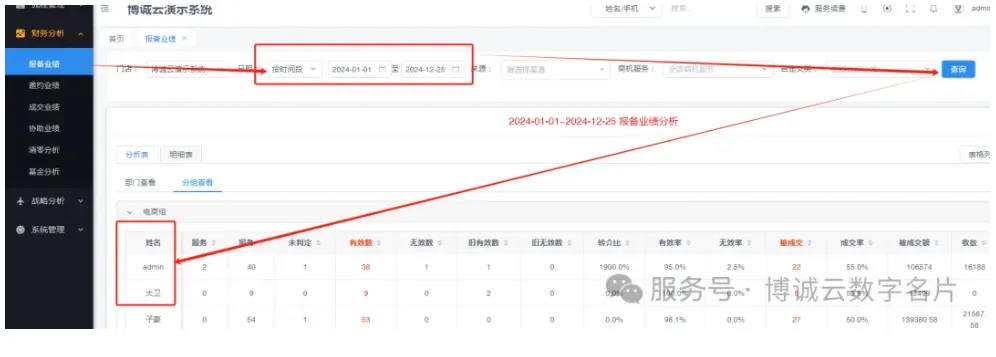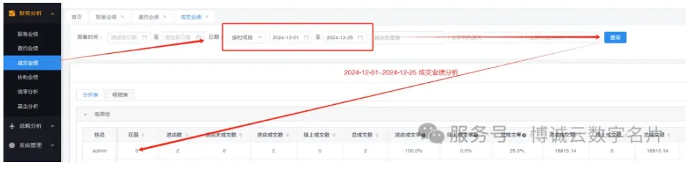 年度成交客资总结数据,我们可以查询财务分析中的成交业绩(如下图)