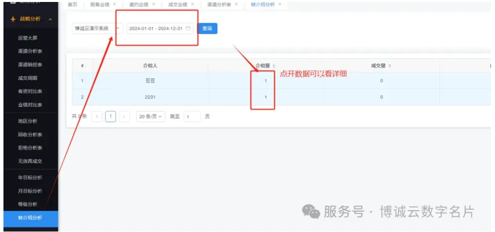 年度转介绍数据总结,我们可以查询战略分析中的转介绍分析(如下图)