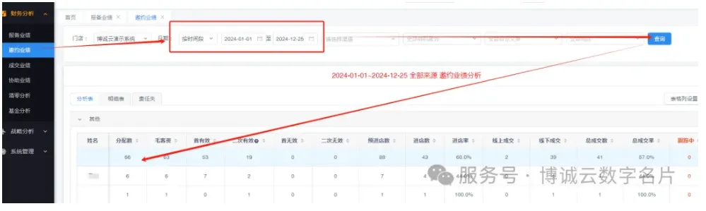 年度邀约数据分析总结数据,我们可以查询财务分析中的邀约业绩报表(如下图)