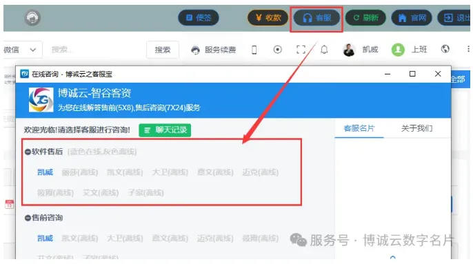 如果您使用的是博诚云桌面版可以点击右上角【客服】按钮即可选择人员发起会话。