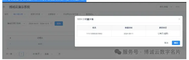 系统可自动提醒回访,提升客户满意度和复购率。及时了解客户的需求和意见,解决客户问题,增强客户的信任和忠诚度。 通过数字化系统提供的高效服务,影楼能够展现专业形象,增强客户信任。例如在线客服、小程序等数字化手段,让客户可以随时随地了解影楼的产品和服务,预订拍摄套餐,查询拍摄进度等,极大地方便了客户,提升了影楼的品牌形象。 #博诚云客资系统 #博诚云SCRM系统 #博诚云客资SCRM