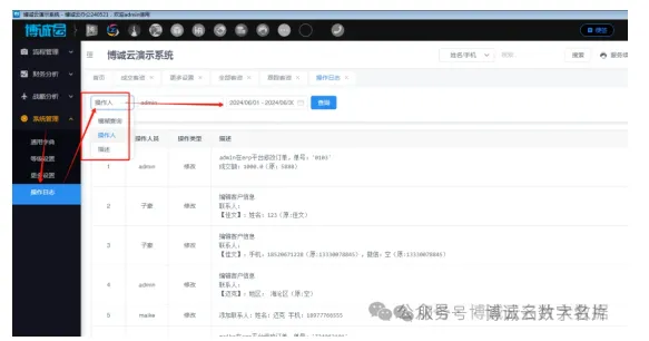 在使用中,如果想查询某个账号在SCRM系统中的操作情况,那么我们可以点击软件的系统管理-操作日志,根据您设置的查询条件查询某个时间内的操作日志(如下图)