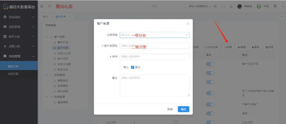 注:右上角新增时,先设置一级大分类,再添加二级子分类,系统选择时只能选择二级子分类。若新增时上级分类选择“根节点”,则该类别默认为一级分类。