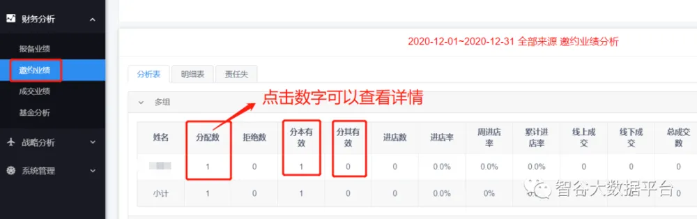 2.邀约业绩新增分配数以及点击该分配数可查看分配详情,新增点击‘分本有效’、‘分其有效’可查看分配详情