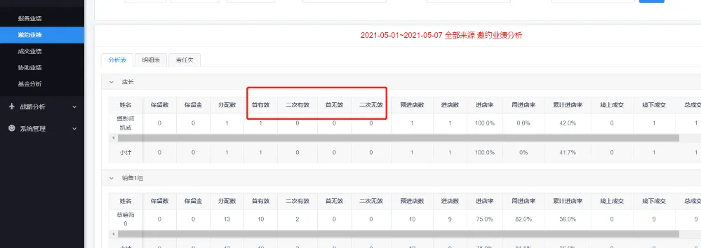 5.修改邀约业绩、渠道分析表:有效数拆分为首有效、二次有效统计,无效数拆分为首无效、二次无效统计